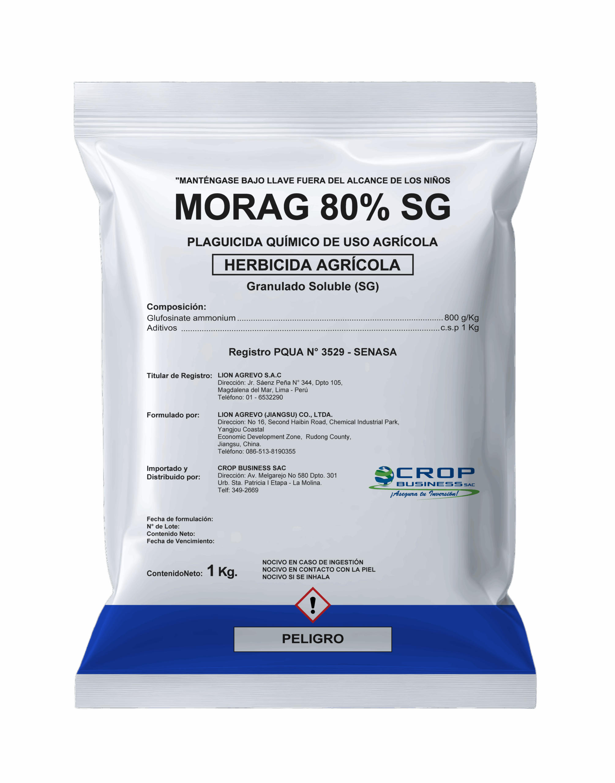 MORAG 80% SG, es un herbicida formado por el ingrediente activo Glufosinato de Amonio, este producto se presenta como un herbicida de contacto, actúa directamente sobre los tejidos verdes de la planta, a través de las cutículas. No ingresa por las raíces.